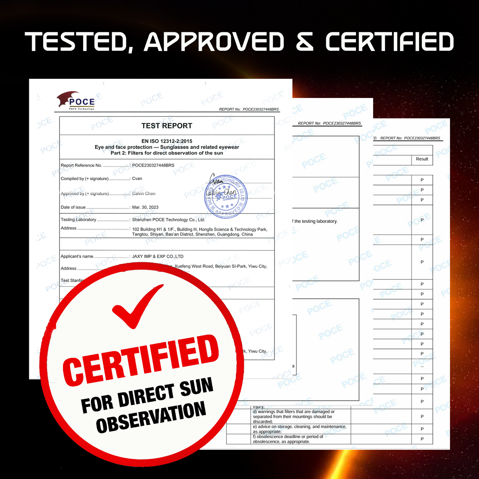 Get set for the solar extravaganza with GALXIUM Solar Eclipse Glasses 🕶️🌞! Our "Sunfire" design is blazing with style, igniting your view of the solar eclipse 🔥🌑. Each pair is a fusion of safety and awesomness, meeting ISO standards and AAS approved ✅🌌.