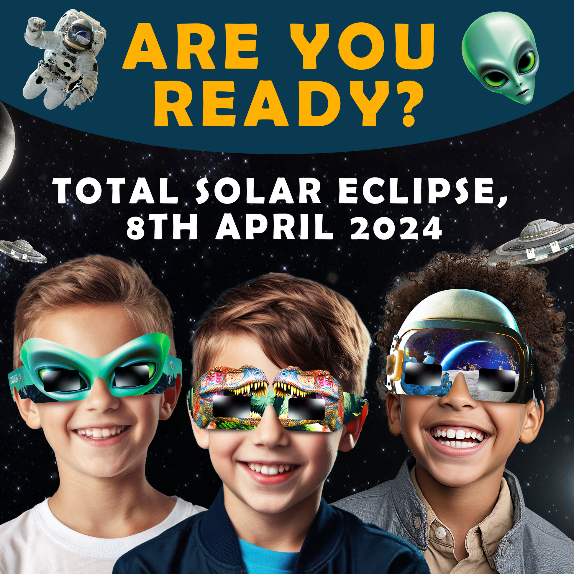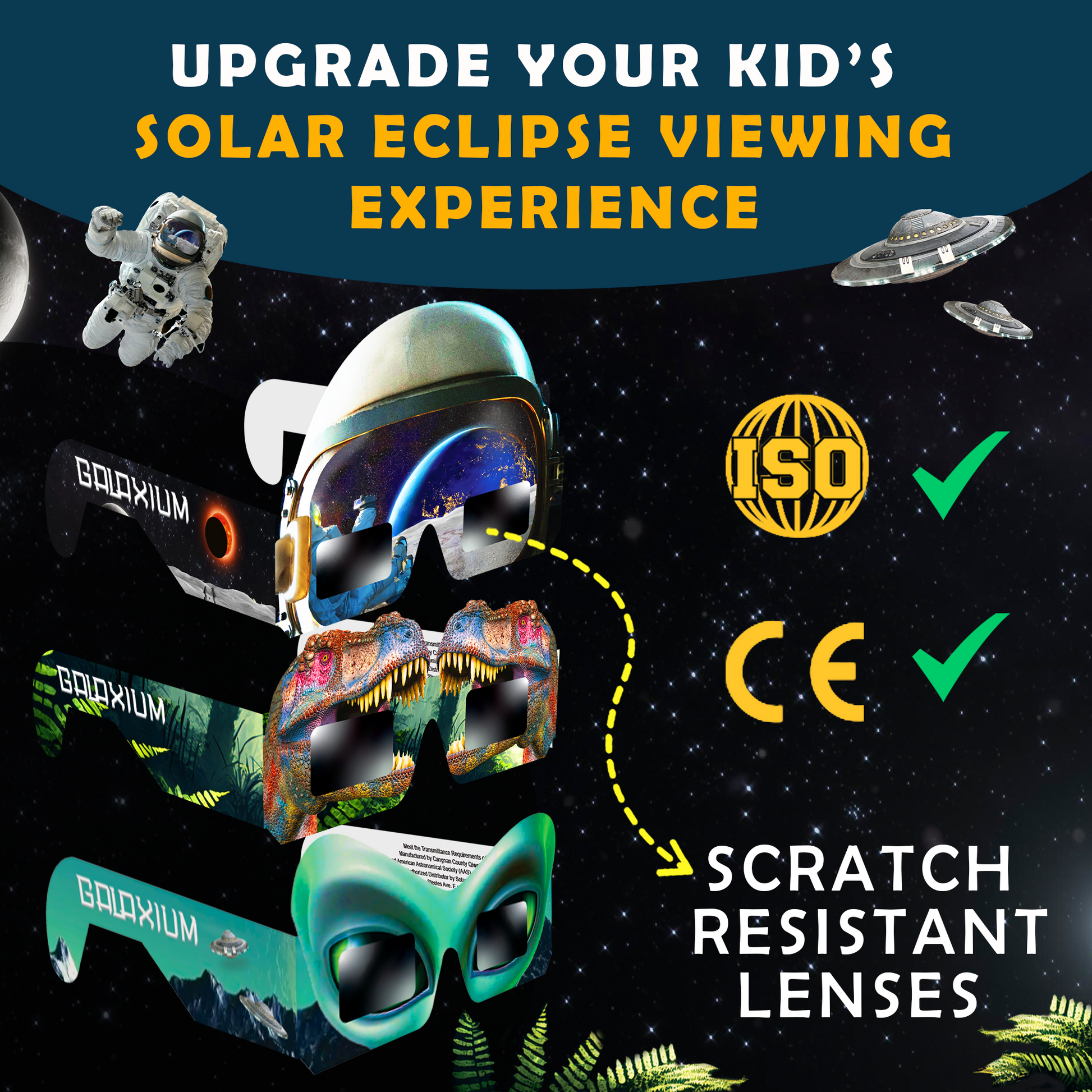 Feel hearts ❤️ flutter and excitement 🎈 soar with every glance through our solar eclipse viewing glasses 🌒 for kids. Our alien 👽, astronaut 👨🚀 & dinosaur 🦖 designs will transform your child's experience of the 2024 solar eclipse into a fantastical journey! 🚀